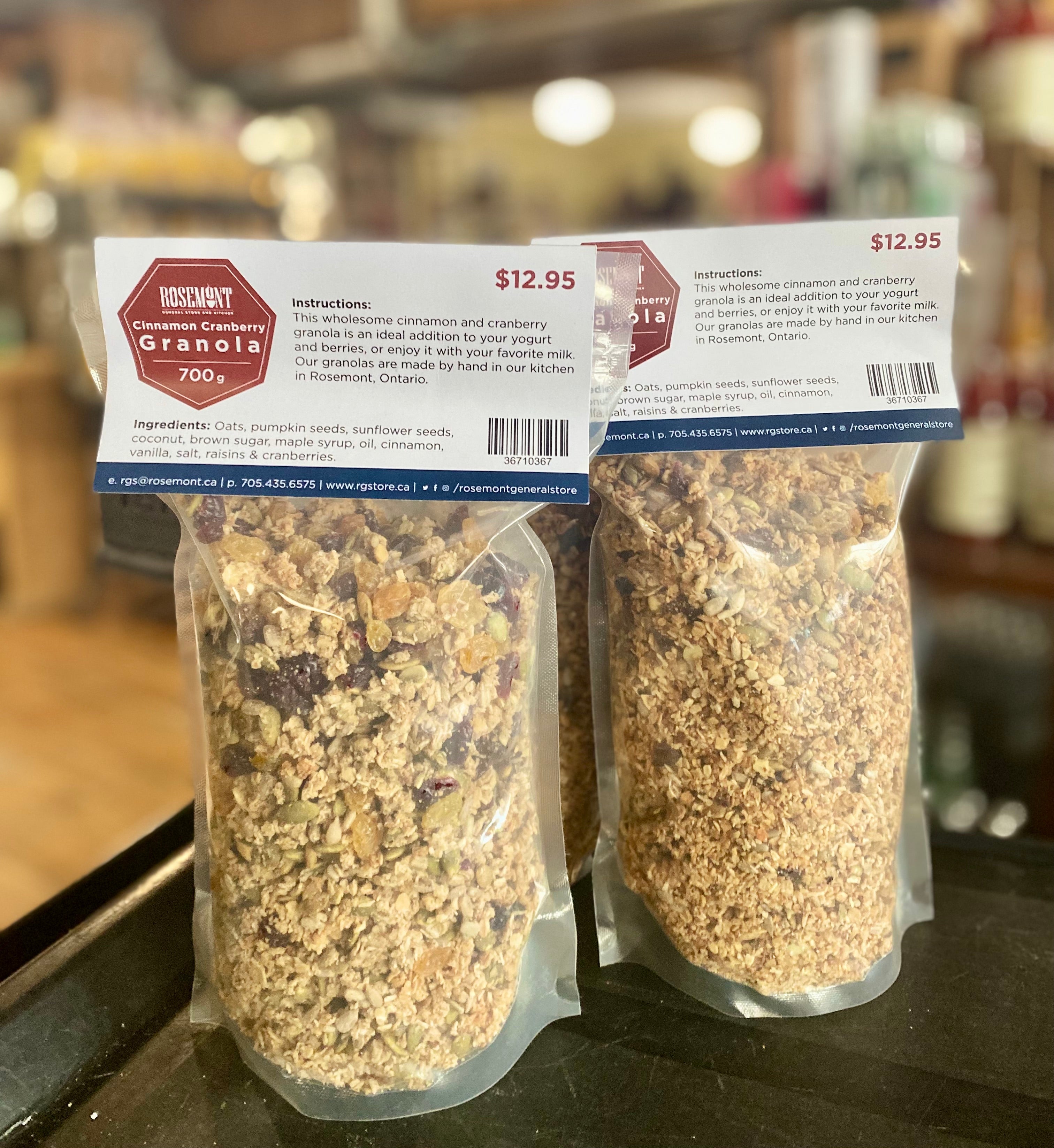Our wholesome cinnamon and cranberry granola is an ideal addition to your yogurt and berries, or enjoy it with your favourite milk. Our granolas are housemade by hand in our kitchen in Rosemont, Ontario.