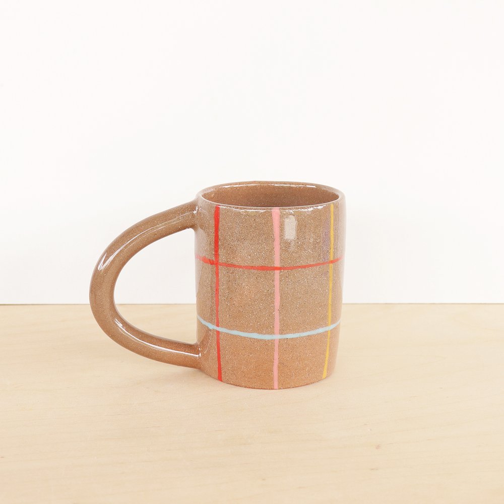 Stoneware mug with hand painted grid pattern and large, easy to hold handle.